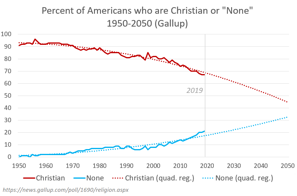 2. American religious belief and behavior have declined alongside religious identification, as Gallup has consistently shown, so Americans are not simply becoming less fond of Christian organizations. Americans are increasingly abandoning religion entirely.