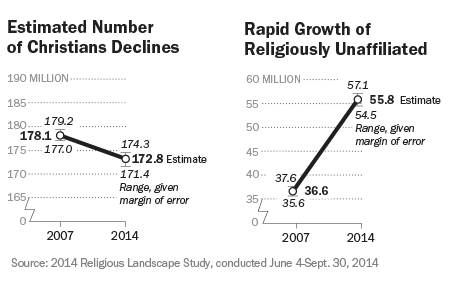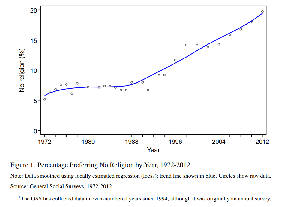 - ..."attend church or synagogue ... never" almost doubled from 14% in 1992 to 27% in 2017, while the proportion who attended "every week" declined from 34% in 1992 to 23% in 2017.